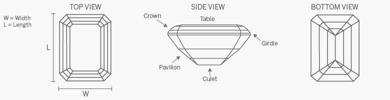 The emerald cut diamond is a rectangular shape with truncated corners and a broad and flat plane that resembles stair steps when viewed from above. This style is referred to as a ‘step cut’. While it typically has less fire and brilliance than brilliant cuts, the broad flat plane of this shape highlights the clarity of a diamond and its natural crystalline rectangular growth. The optimum clarity is VS1/VS2 or higher.